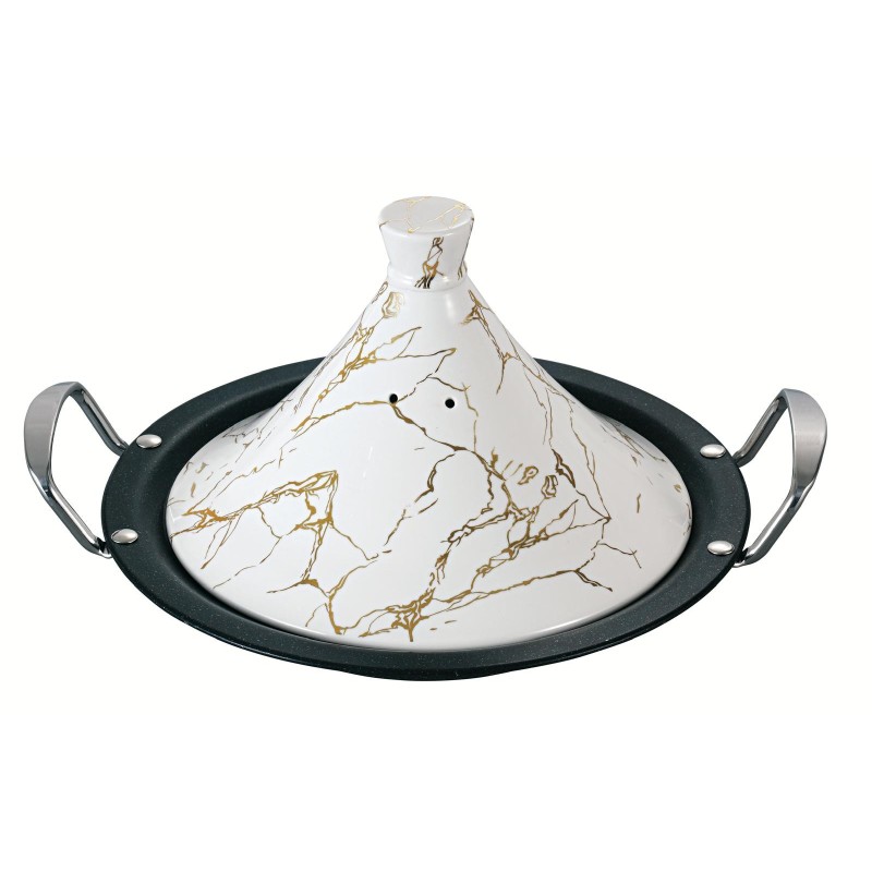 Tajine en aluminium 34cm à finition marbrée blanc & or, parfait pour des cuissons lentes, parfumées et fondantes.
